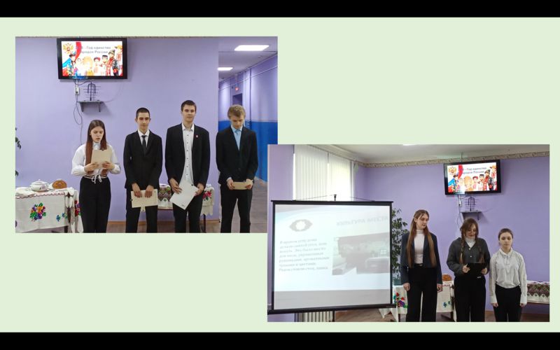 Девушки 10 класса представили богатое наследие украинской культуры. Заместитель директора по воспитательной работе Иванова Л. А. рассказали о символике вышиванки, значении рушников и украинской кухни. Гости с удовольствием пробовали вареники — одно из самых известных украинских блюд.